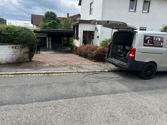 Unser Maschine arbeitet mit 80 % Luft und 20 % Wasserreinigt die Steine schonend und anschließend werden die Poren mit einer speziellen Versiegelung geschlossen.